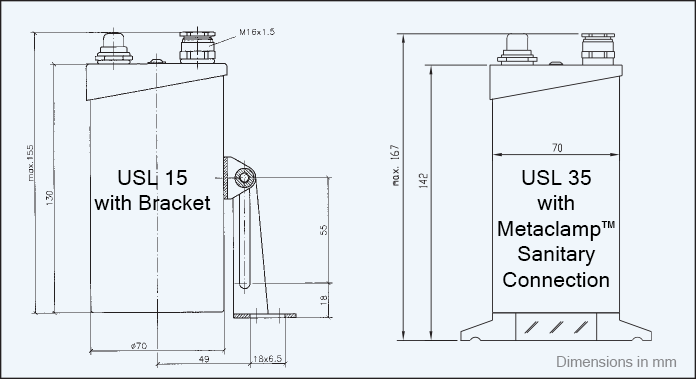 LumiStar® 2000 is the world’s brightest mid-size sight glass luminaire:  LED luminaire is three times brighter than a typical sight glass light, offering an unprecedented view of processes.  Ultra-bright LED provides 2000 lumens at full brightness, three times the light output than a typical 100-Watt halogen light.  The total internal reflection (TIR) lens with 20-degree beam angle, ideal for vessel illumination through sight glass with maximum light output and less than 5% loss of light output.  The light is capable of continuous operation and emits cool white, 5500K color temperature, optimized for stainless steel vessels.  The light is designed for cool operation equipped with temperature-based current limiting and automatic dimming; over temperature shutdown.  The LEDs have a long service life and are vibration and impact resistant.  No heat radiation is directed into the process vessel (cold light output).   The housing is available with a mounting bracket (USL16 Light) or a sanitary clamp connection (USL36 Light)